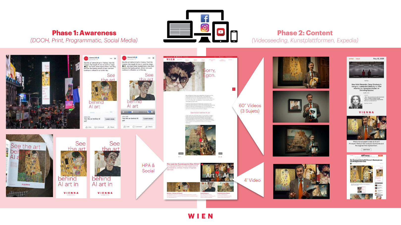 Ziel war es, Awareness für Wien zu schaffen, die Bekanntheit als imperiale aber auch moderne Reisedestination zu steigern (history meets energy) und damit Wien für unsere potentielle Zielgruppe in den USA noch attraktiver zu machen. Da AI derzeit auch in der Kunstwelt ein omnipräsentes, polarisierendes Thema ist, wurde dieser Insight in der Konzeption aufgegriffen und mit einem publikumswirksamen, leichten Zugang (Cat-Content) verknüpft. Mittels Midjourney und Dall-E wurde Cat-Content, inspiriert von Schiele, Klimt und weiteren mit Wien verbundenen Künstlern generiert. Der cat-chy Aufmacher generierte Aufmerksamkeit in der Zielgruppe, und regte zur tiefergehenden Auseinandersetzung mit den Originalen (idealerweise in Wien) an. Zentrale Botschaft auf sämtlichen Kanälen (DOOH, Print, Social MediaOutstream etc.): See the art behind AI art.