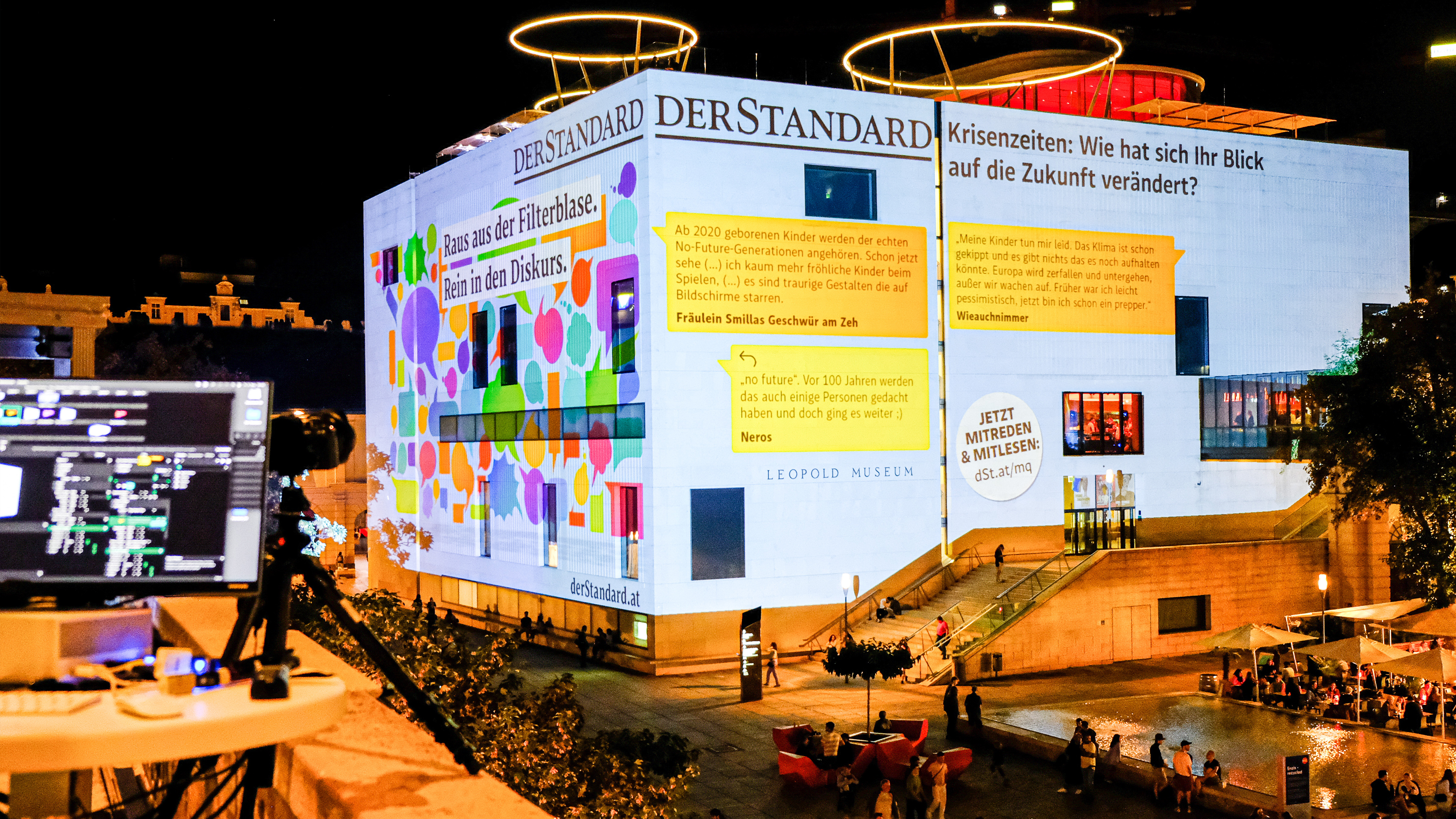 An einem Wochenende in Wien wurde der Online-Diskurs der STANDARD Community aus der rein digitalen Welt herausgehoben und auf das Leopold Museum im Wiener MQ auf über 1.000m2 projiziert. So wurde das STANDARD-Forum aufmerksamkeitsstark in den öffentlichen Raum gebracht: Die Menschen vor Ort konnten live mitlesen und mitdiskutieren.